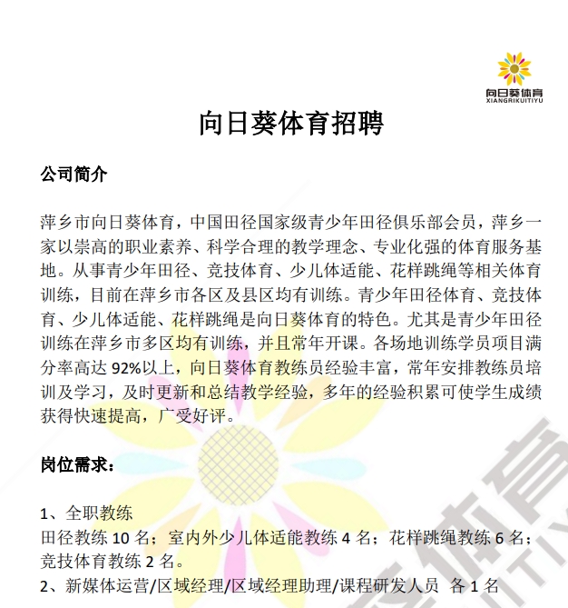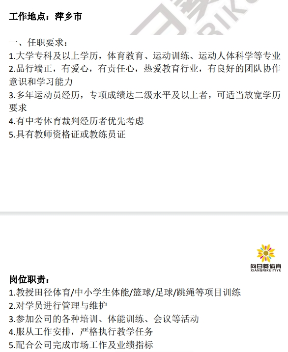 【教培招聘】向日葵体育招聘江西省萍乡、湖南省体培教练
