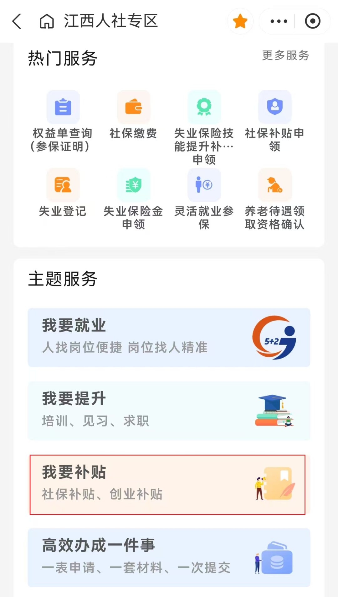 C.关注微信公众号“江西人社”→微服务→我要办事→我要补贴→毕业生一次性求职补贴申领。