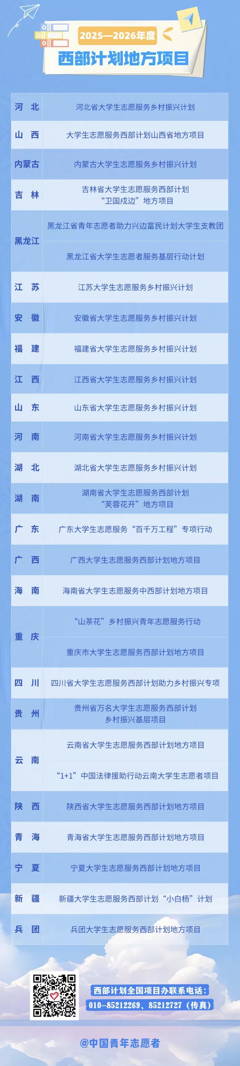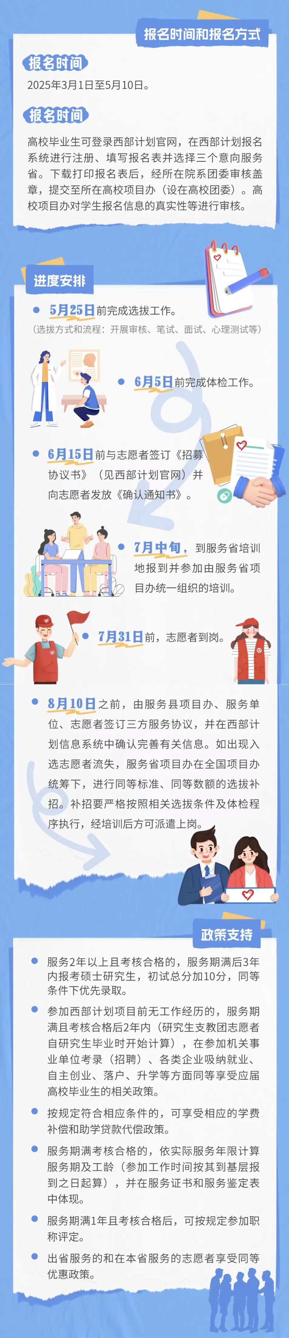 3月1日至5月10日,2026年普通高等学校应届毕业生或在读研究生,可通过微信公众号“西部志愿汇”(菜单栏中的“我要报名”)或登录西部计划官方网站(http://xibu.youth.cn),在西部计划报名系统中注册报名。