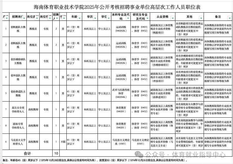本次公开招聘事业编制工作人员共10名,均为专业技术人员。具体详见《海南体育职业技术学院2025年公开考核招聘事业单位高层次工作人员职位表》(附件1)。