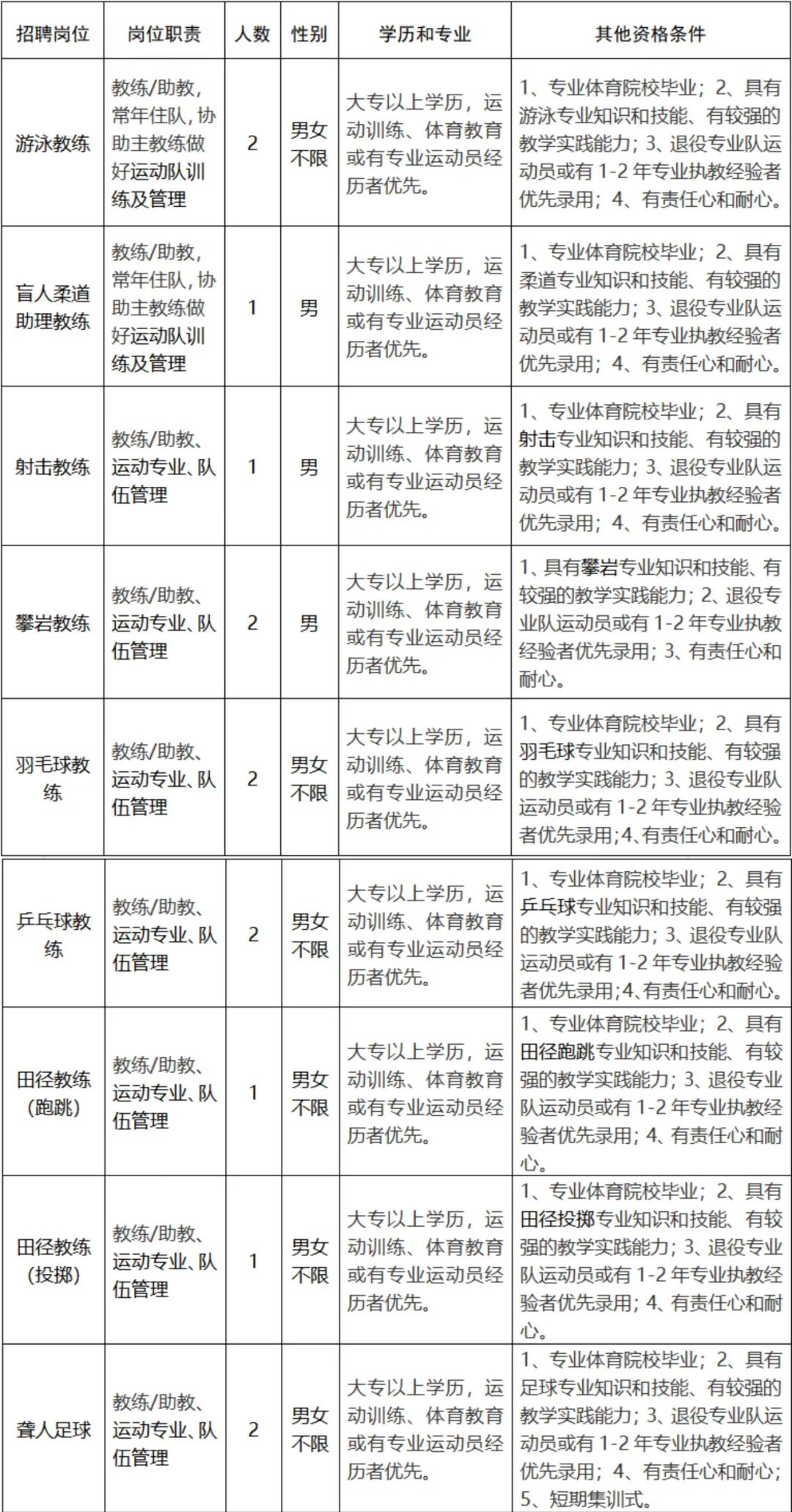 (三)招聘岗位及具体要求本次计划面向社会公开招聘教练员,具体岗位信息见下表: