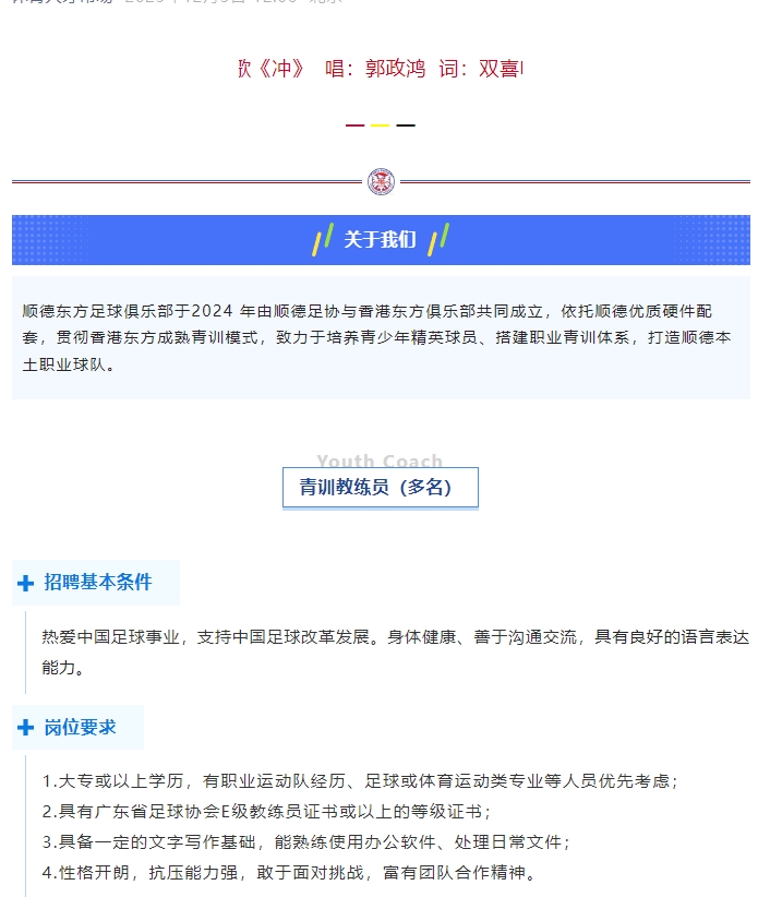 【体育招聘】顺德东方足球俱乐部招聘足球青训教练员