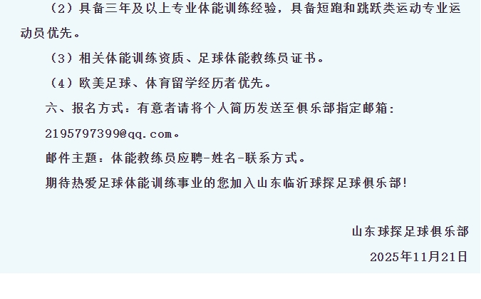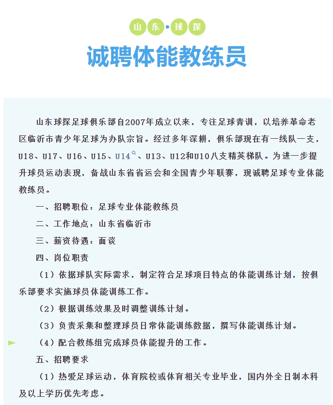 【体育招聘】球探足球俱乐部招聘体能教练员
