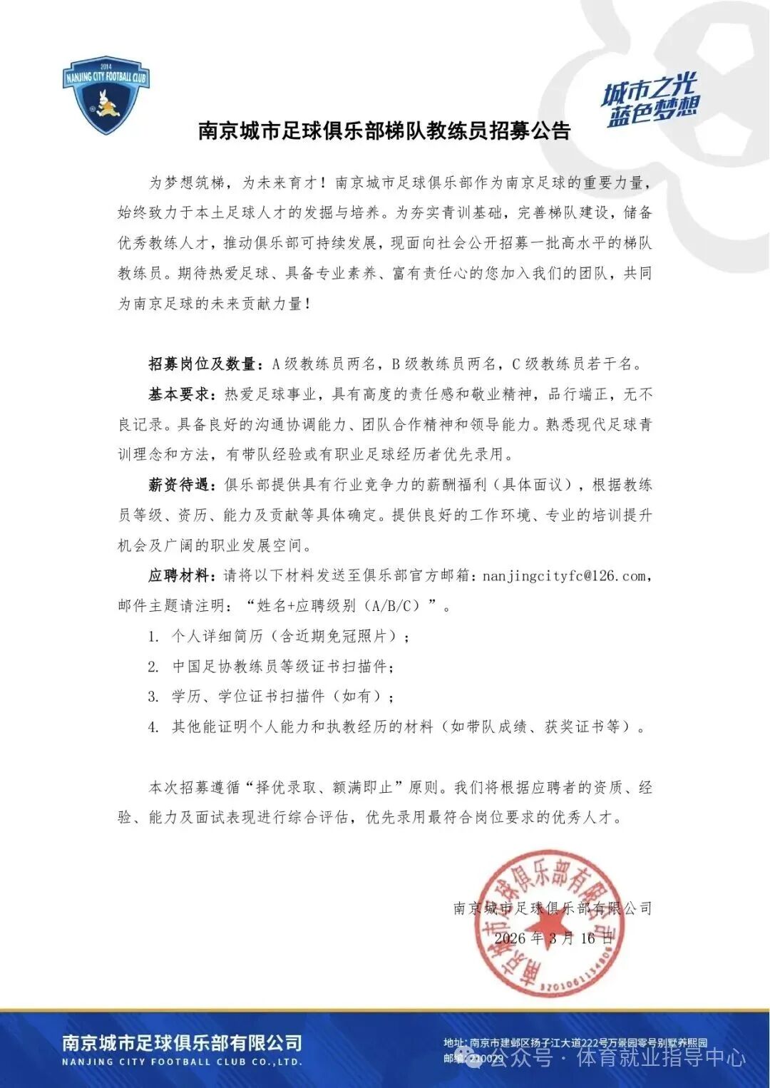 【体育招聘】南京城市足球俱乐部招募梯队教练员