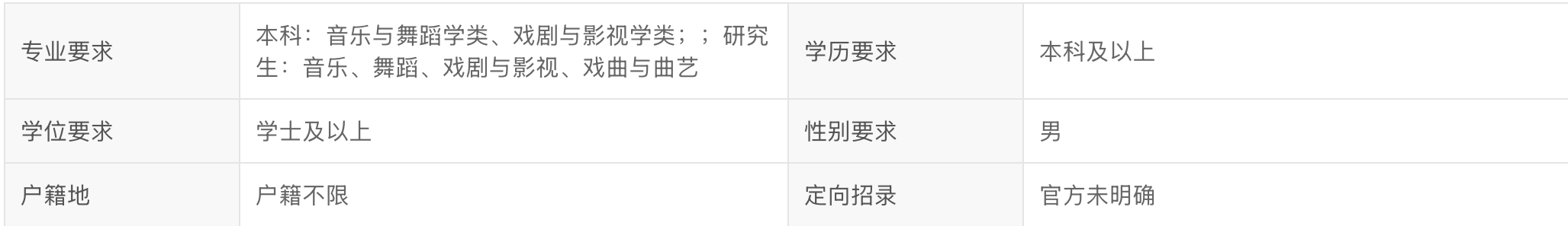 三、专业要求:本科:音乐与舞蹈学类、戏剧与影视学类;研究生:音乐、舞蹈、戏剧与影视、戏曲与曲艺