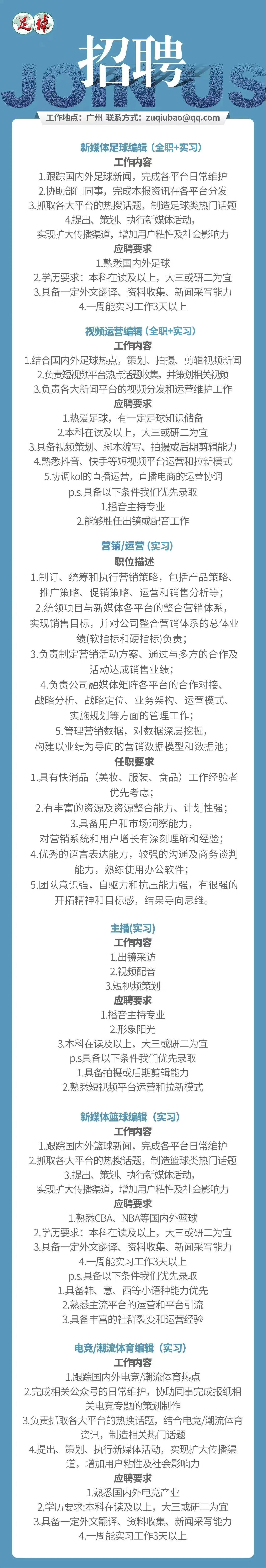 【体育招聘】《足球》报招聘新媒体、营销、运营、主播、体育编辑、实习生等