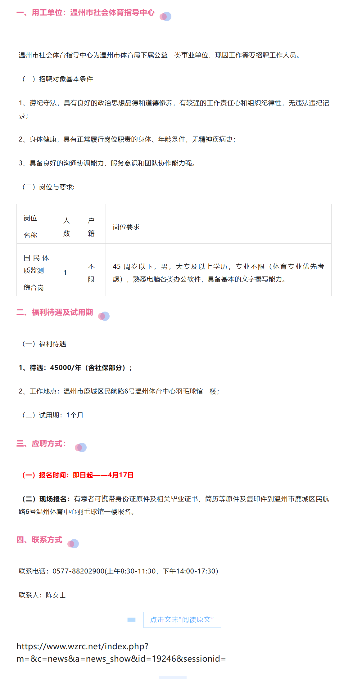 【体育招聘】温州市社会体育指导中心招聘工作人员